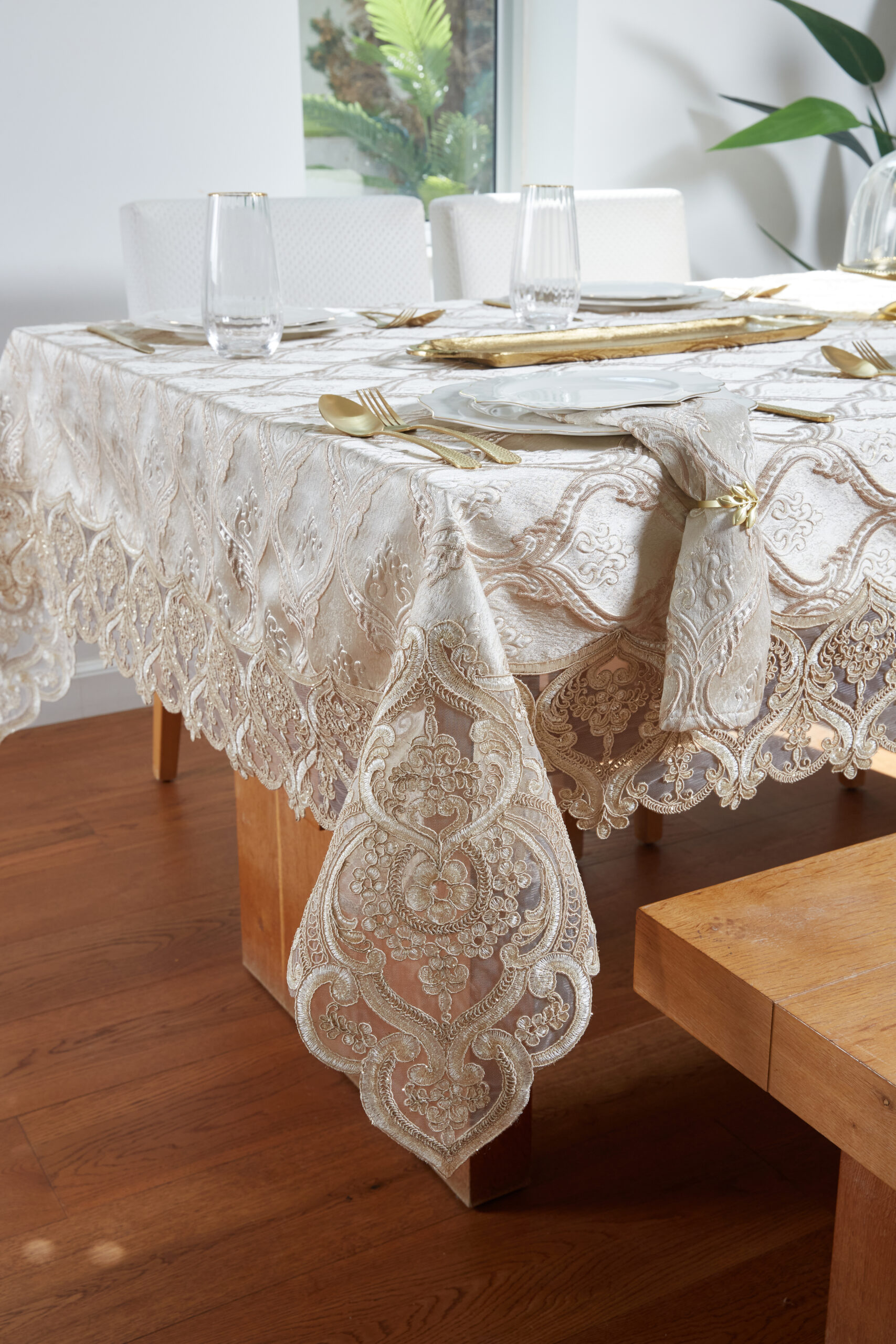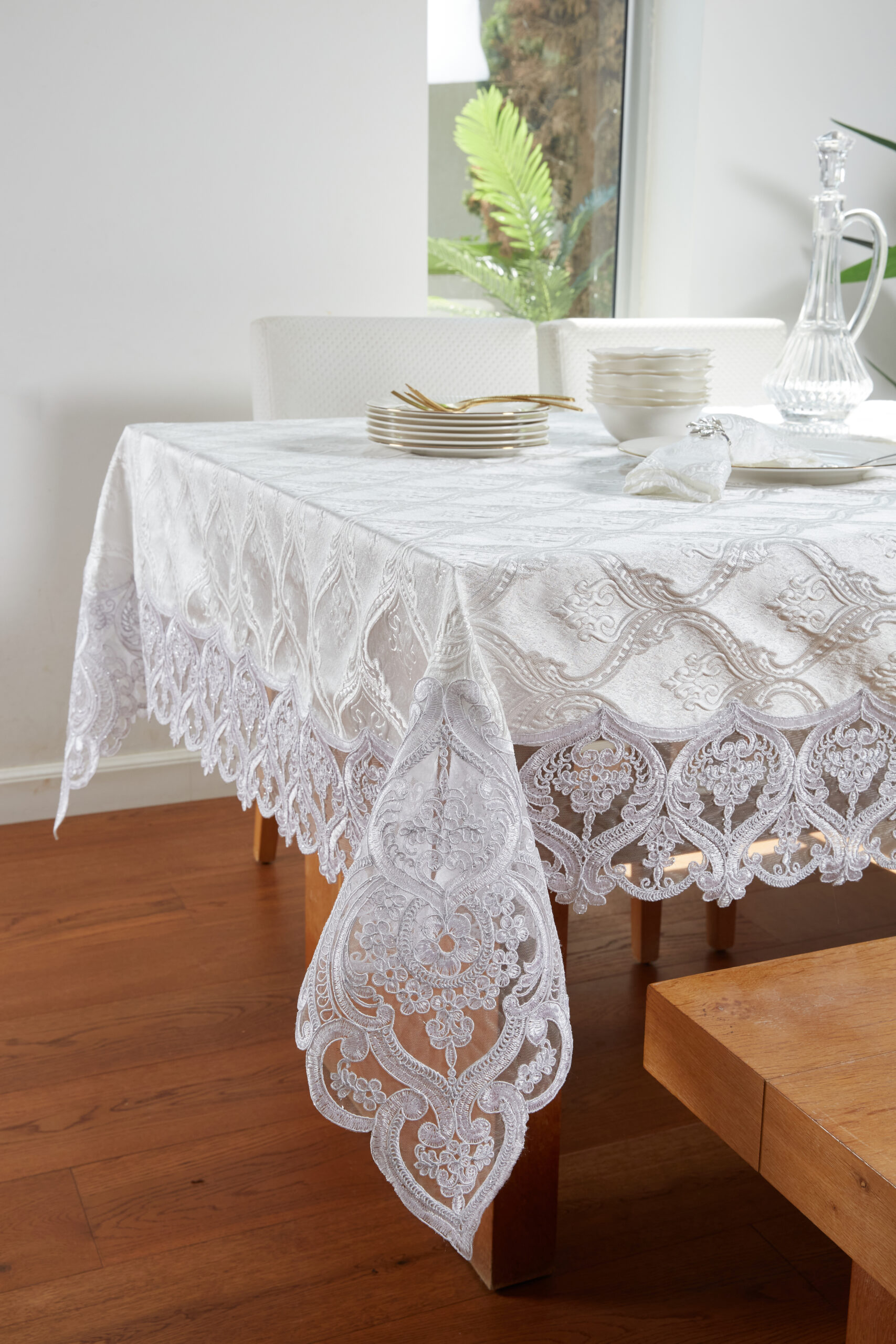 מפות אירוח אלגנטיות במיוחד עשויות מבדי ג'אקרד יוקרתיים ארוגים בדוגמא עשירה במיוחד. המפה מעוצבת עם תחרה רקומה מלכותית מסביב אשר בשילוב הבדים המיוחדים מעניקים מראה יוקרתי לשולחן ולחדר האוכל. המפות עשויות מבדי ג'קארד דוחי כתמים ועמידות בפני מספר רב של כביסות.